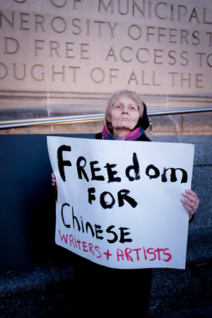 Retired writer Marilyn Moorcroft, seventy-one, teared up. “It makes me cry, that people suffer so much. I always babble so much with no consequences. It really upsets me how these writers are attacked for their work,” allowing, however, that she was only vaguely familiar with Ai’s art. Still, she had tried to persuade her friends from Greenwich Village, where she lives, to join her at the rally, but eventually travelled to Brooklyn alone. Originally from Iowa, Moorcroft said she grew up in a liberal climate. She held up a sign reading “Freedom for Chinese Writers + Artists.”