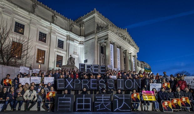 But Ilham Tohti and Liu Xiaobo, who won the Nobel Peace Prize in 2010 for non-violent struggle for human rights, were not household names to the Brooklyn crowd. Ai was the main attraction. As the rally moved down Eastern Parkway to the Brooklyn Museum—where the freedom-of-expression-themed art exhibition “Ai Weiwei: According to What?” opens April 17—some participants handcuffed their wrists together to show their solidarity. Rally organizers corralled nearly two hundred supporters onto the museum steps for a photograph they said they planned to Tweet to the artist. They lined up behind large placards reading “FREE EXPRESSION” in English and Chinese and raised their fists for the cameras. Ai retweeted my picture of the scene, too, as he did those taken by about thirty-five others present. He was virtually there.