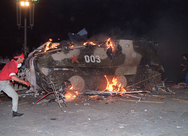 Students set fire to an armored personnel carrier near Tiananmen Square in Beijing in this archival photo from June 4, 1989.