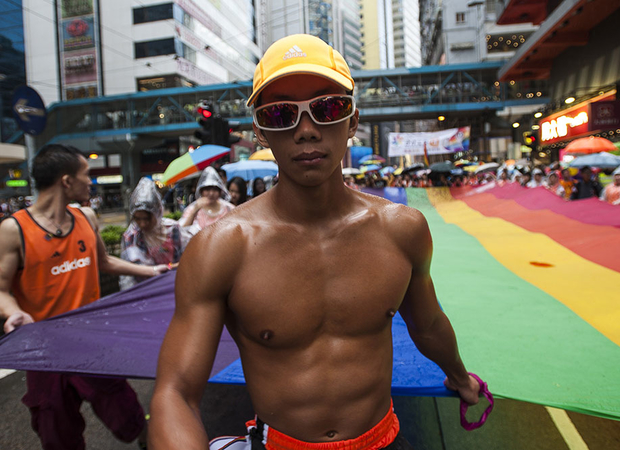 People march in Causeway Bay during the Gay Pride parade in Hong Kong on November 8, 2014. The atmosphere was jovial as nearly two thousand people, some wrapped in rainbow-colored flags and some dressed in drag, took to the streets.