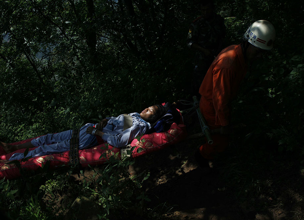 Rescuers transfer a woman injured when a 6.5-magnitude earthquake struck her village in Qiaojia County, Yunnan province on August 5, 2014. At least 398 people were killed.