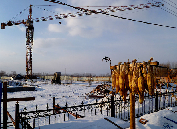 A crane rises above a construction site on the outskirts of Da Huangdi (Wasteland) where new construction has been spurred by success in local rice production.