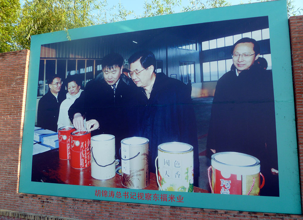 Then Chinese president Hu Jintao inspects the factory at Eastern Fortune Rice company on a visit to Da Huangdi (Wasteland) in 2007.
