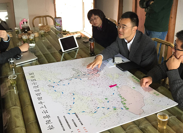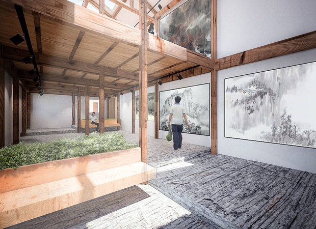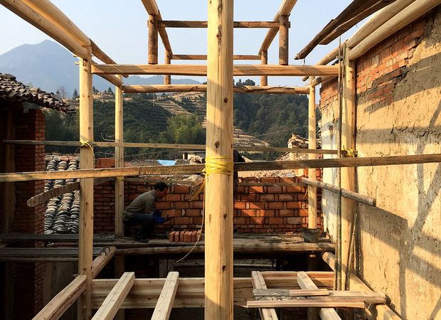 In the early stages of project work, a building in Pingtian Village (平田村) shows the exposed wood beam construction designed by a team of architects from Tsinghua University, University of Hong Kong, and Chinese Central Academy of Fine Arts. Because earthen-walled construction doesn't support much weight, architects are reconstructing some of the buildings with new wood frames.