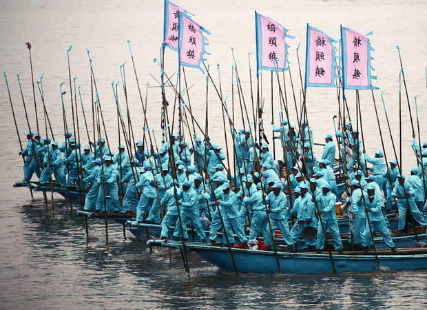 Villagers dressed in traditional costume pole boats during the 2008 Qintong Boat Festival in Taizhou City, Jiangsu province.