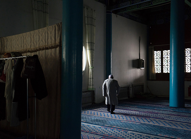 An observant man walks to the corner of the main prayer hall of Najiahu Mosque before mid-day prayer.