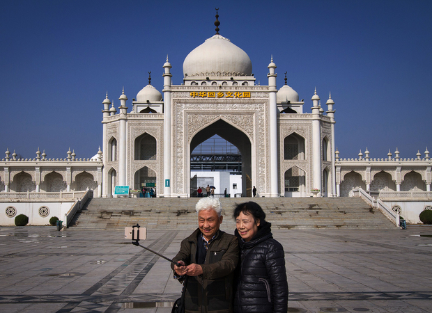 Visitors take a selfie in front of the Taj Mahal-inspired main entrance to the Hui Culture Park. The park’s name is inscribed in yellow over the gates.