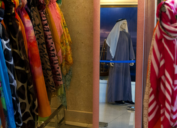 A store inside the Aisha Palace sells souvenir scarves. The mirror reflects a mannequin wearing an example of a traditional Arab outfit, often known as a dishdasha or a thawb, that was donated by the Embassy of Kuwait in Beijing.