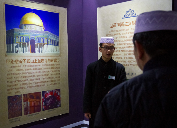 A Hui tour guide gives visitors an introduction to the “Islamic Civilization to the World” exhibit in the Aisha Palace.