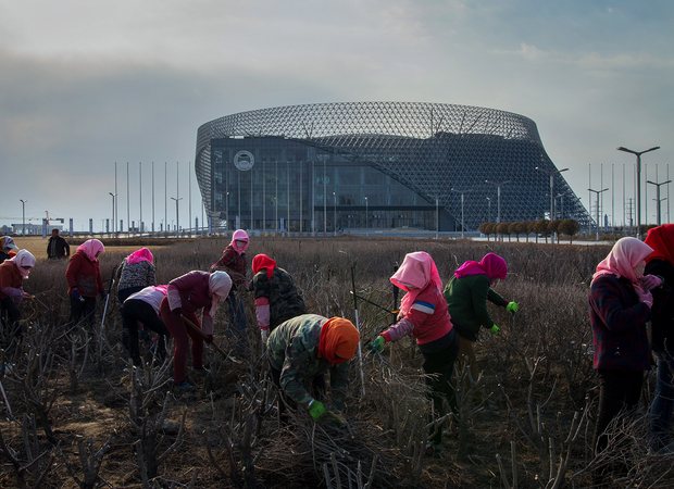 Workers attend to the landscaping in front of Ningxia International Hall, which was completed in 2015 and was the site of the China-Arab States Expo the same year.