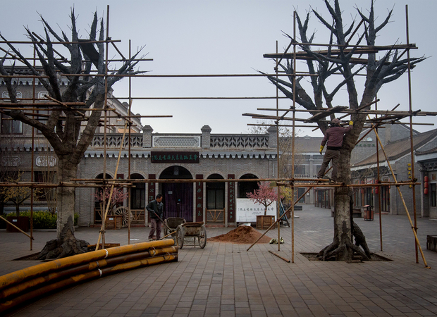 Workers decorate artificial trees on the “First Hui Street of China.”
