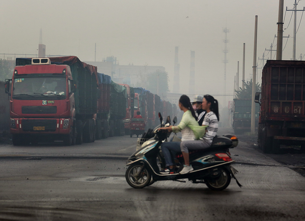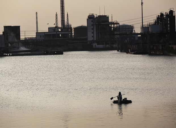 Wastewater from a sewage treatment plant in Hengtai county is released into the marshland near the Zhulong River. The partially submerged sign reads, ‘Danger: Discharge Site with Deep Water. Take Caution.’