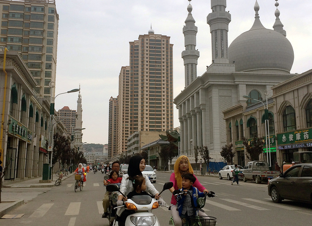 Hui women drive their children home from school on motorcycles, Linxia Hui Autonomous Prefecture, Gansu, May 2016.