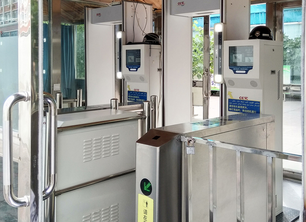 A security checkpoint with an iris-scanner at the entrance to the Aq Mosque, in Urumqi, 2018.