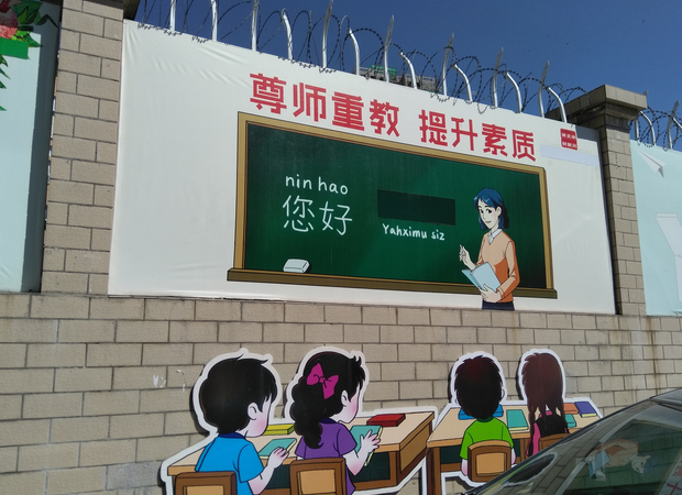 Uighur (modified Arabic) script “disappeared,” Urumqi No.1 Primary school, 2018.