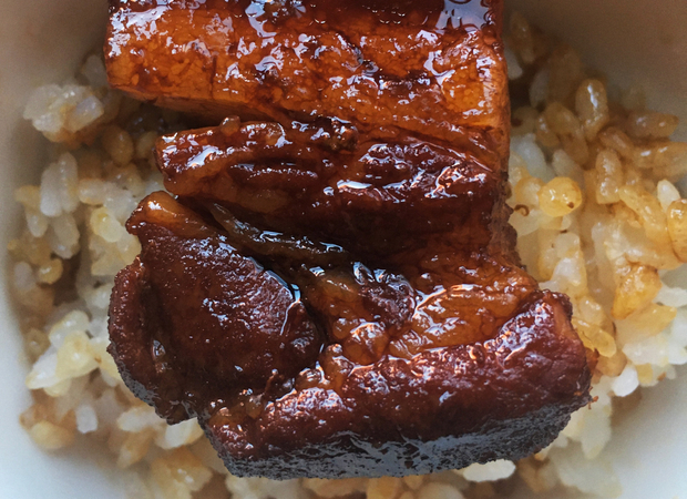 A meal with a strong, simple identity: hongshaorou (red-braised pork belly) over white rice.