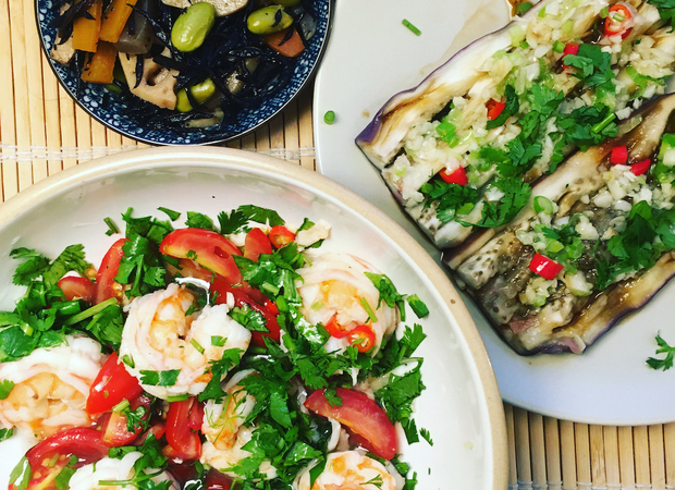 A meal with an ambiguous identity: Thai shrimp salad, Japanese hijiki salad, Chinese steamed eggplant.