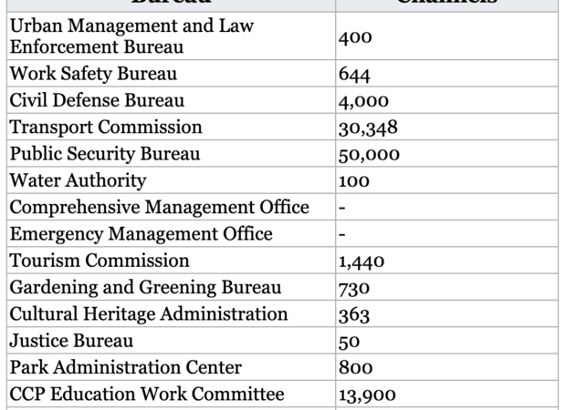 A table from a 2019 procurement notice from Beijing, showing the number of cameras in each bureaucracy that would be linked together after the completion of a government video-sharing platform. Translation by ChinaFile.
