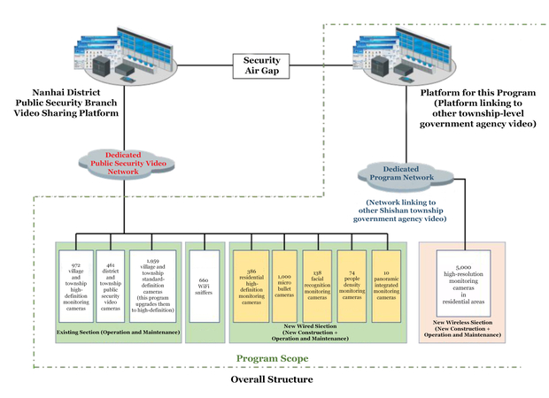 A diagram of camera types and surveillance system networking, from a 2019 procurement notice issued by the Shishan township Comprehensive Management, Petitioning, and Stability Maintenance Office in Guangdong province.