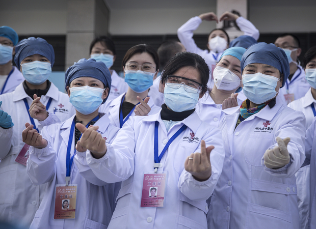 Healthcare workers pose for photos as the last batch of COVID-19 patients are discharged from the Wuchang Fangcang makeshift hospital in Wuhan, Hubei province, March 10, 2020.