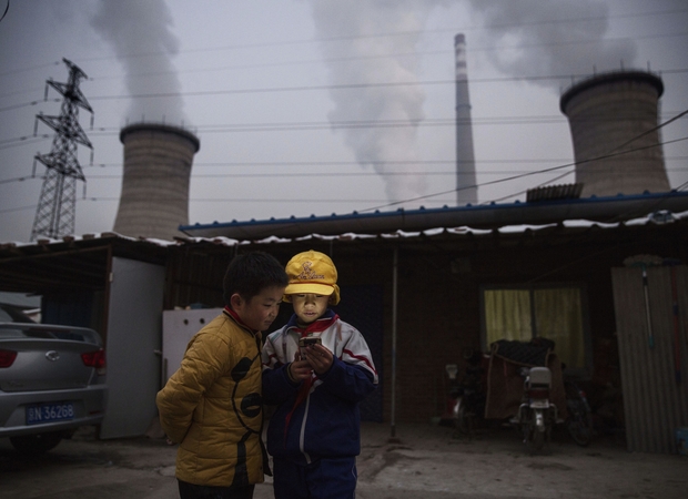 Boys look at a smartphone in front of their house, next to a coal fired power plant, on the outskirts of Beijing, November 27, 2015.