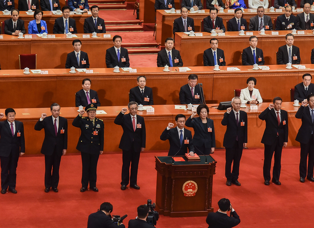 Newly elected state councilors (left to right) Zhao Kezhi, Wang Yi, Wei Fenghe, Vice Premier Hu Chunhua, Sun Chunlan, and Liu He, and state councilors Wang Yong and Xiao Jie, led by Vice Premier Han Zheng (front center) swear an oath during the Seventh Plenary Session of First Session of the 13th National People’s Congress (NPC) at the Great Hall of the People in Beijing, March 19, 2018.
