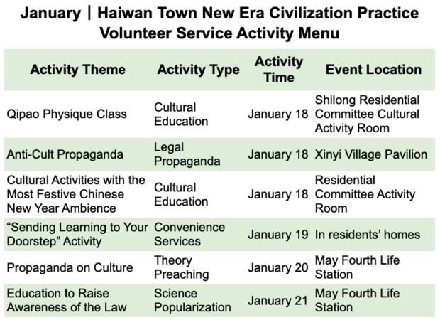 Top-left: ‘Civilization Caravan’ volunteers stage a storytelling performance, Zhidan county, Shaanxi province, posted to Weibo November 24, 2021; top-right: volunteers give free blood pressure checks, Guangxi Zhuang Autonomous Region, Liuzhou city, Liunan district, posted November 11, 2021; bottom-left: police officers participate in an anti-fraud and cross-border crime publicity campaign at a local center, Huize county, Yunnan province, posted November 12, 2021; bottom-right: a local center hosts New Year’s activities, Qingchunshan Street, Kangbashen district, Ordos city, Inner Mongolia Au