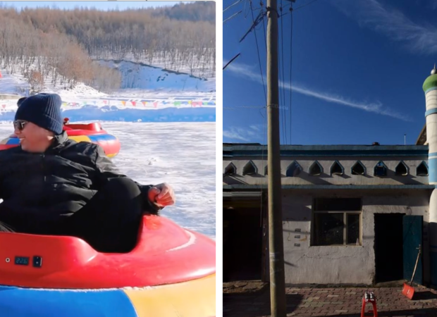 The winter amusement park funded by a local United Front Work Department in Heilongjiang province (left) and a mosque in Jilin province that the UFWD sought to “rectify” (right).