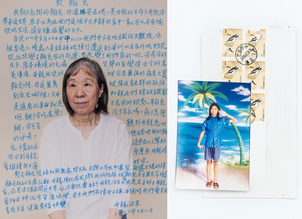 Left: Lai Wai-ling, mother of Yu Man-hon, pictured in August 2022. Her autistic son, then 15, disappeared at the border between Hong Kong and Guangdong in 2000. The overlayed text is of a letter she wrote to her son in October 2022, at Kwok’s invitation.