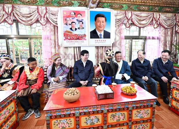 Wang Huning, a Politburo Standing Committee member and Chairman of the Chinese People’s Political Consultative Conference, visits local residents during an inspection tour of Tibet in Nyingchi, southwest China’s Tibet Autonomous Region, July 25, 2023.