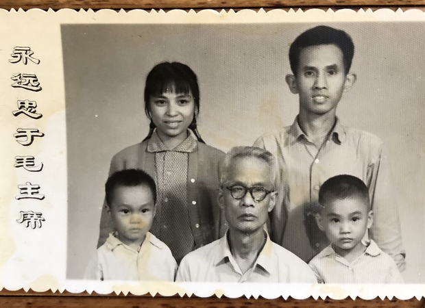 Grandpa with Uncle Hangsheng and his family. The caption in the left margin reads, “Eternal Loyalty to Chairman Mao,” indicating that the photo was taken during the Cultural Revolution.