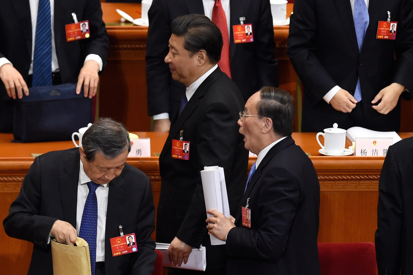 Chinese President Xi Jinping (center) and Wang Qishan (right), a member of the Standing Committee of the Political Bureau of the Chinese Communist Party (C.C.P.) Central Committee and Secretary of the C.C.P. Central Commission for Discipline Inspection (CCDI), leave after the opening ceremony of the National People’s Congress at the Great Hall of the People in Beijing, March 5, 2016.