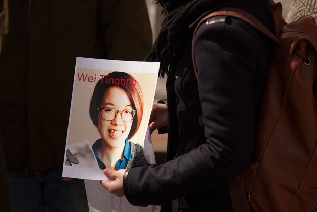 Wen Liu holds a photograph of Wei Tingting at a rally in midtown Manhattan, New York City, on March 18, 2015. The gathering was in protest against the detention in China of Wei and four other feminist activists. Wen, a CUNY graduate student, met Wei when volunteering for the Institute for Tongzhi Studies, an organization dedicated to gender studies in Chinese communities.