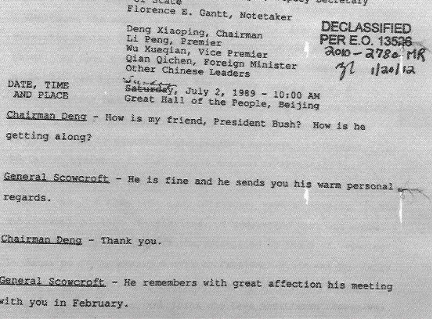 The following comment from Deng Xiaoping from July 2, during General Brent Scowcroft’s secret visit to Beijing while they met in the Great Hall of the People, right on the west side of Tiananmen Square, also caught my eye: