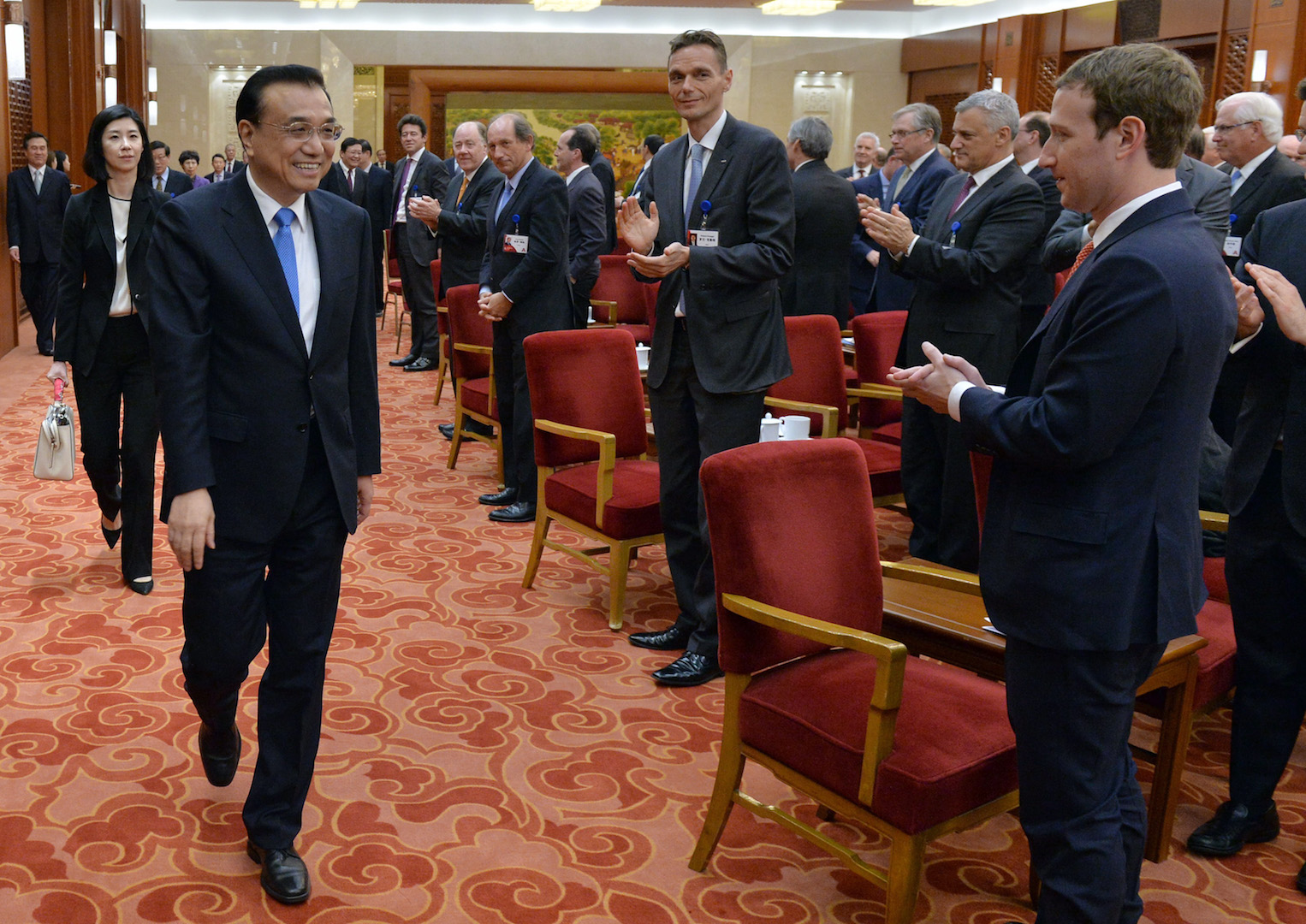 Mark Zuckerberg, Facebook CEO (right) and the overseas representatives of China Development Forum applaud the arrival of Li Keqiang, Chinese Premier (left) during a meeting of top business executives from around the world gathered at a conference sponsored by the Chinese government in the Great Hall of the People in Beijing, March 21, 2016.