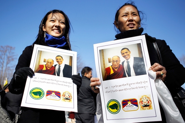Tenzin Lhamo (L) and her mother Dolma Kyizom (R) of New York City hold pictures of the Dalai Lama and U.S. President Barack Obama outside the White House on the occasion of the two leaders’ first visit, on February 18, 2010 in Washington, D.C. President Obama met the Dalai Lama for the third time on February 21, 2014.