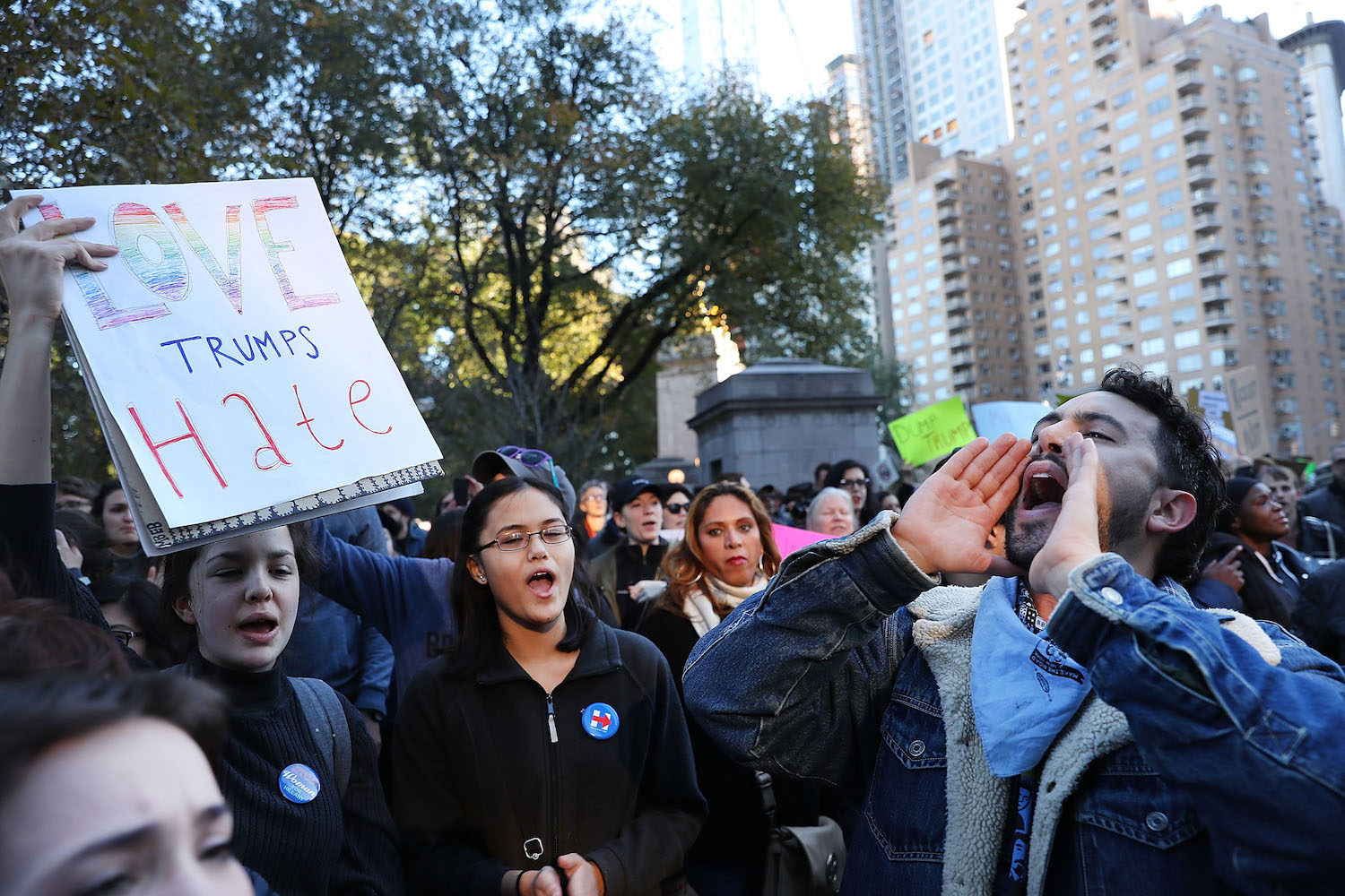 Some at the New York protest also grappled with fears that Trump’s election would cause the U.S. to lose its global status as a standard bearer for democratic values and respect for human rights. Lily, a 15-year-old student at LaGuardia High School in Manhattan, said she couldn’t understand how America’s voters could elect “a racist, sexist bigot.” Suzanne Cushing, 55, worried about Trump’s ability to lead, his views on climate change and abortion rights, and the chance he’ll have to make appointments to the U.S. Supreme Court. “I have family in Italy, and the young kids there are posting on Facebook about how frightened they are of Trump’s America,” Cushing said. “I don’t think it’s just affecting us here, I think it’s really taken a toll on people all over the world.”