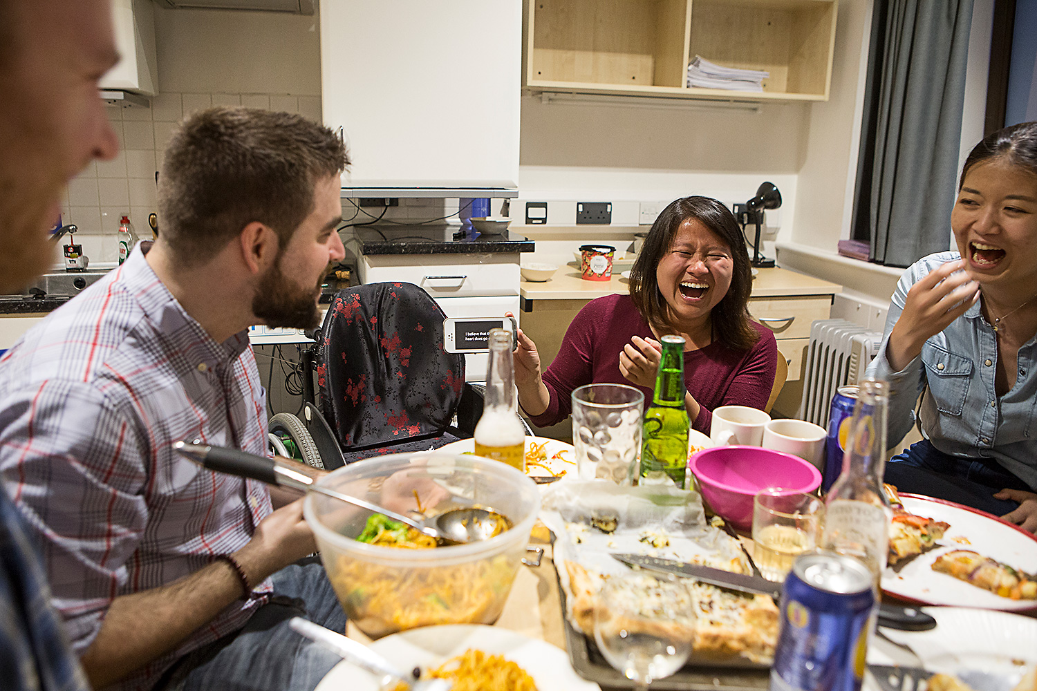Ming hosts a dinner with friends and classmates to celebrate the end of their semester.