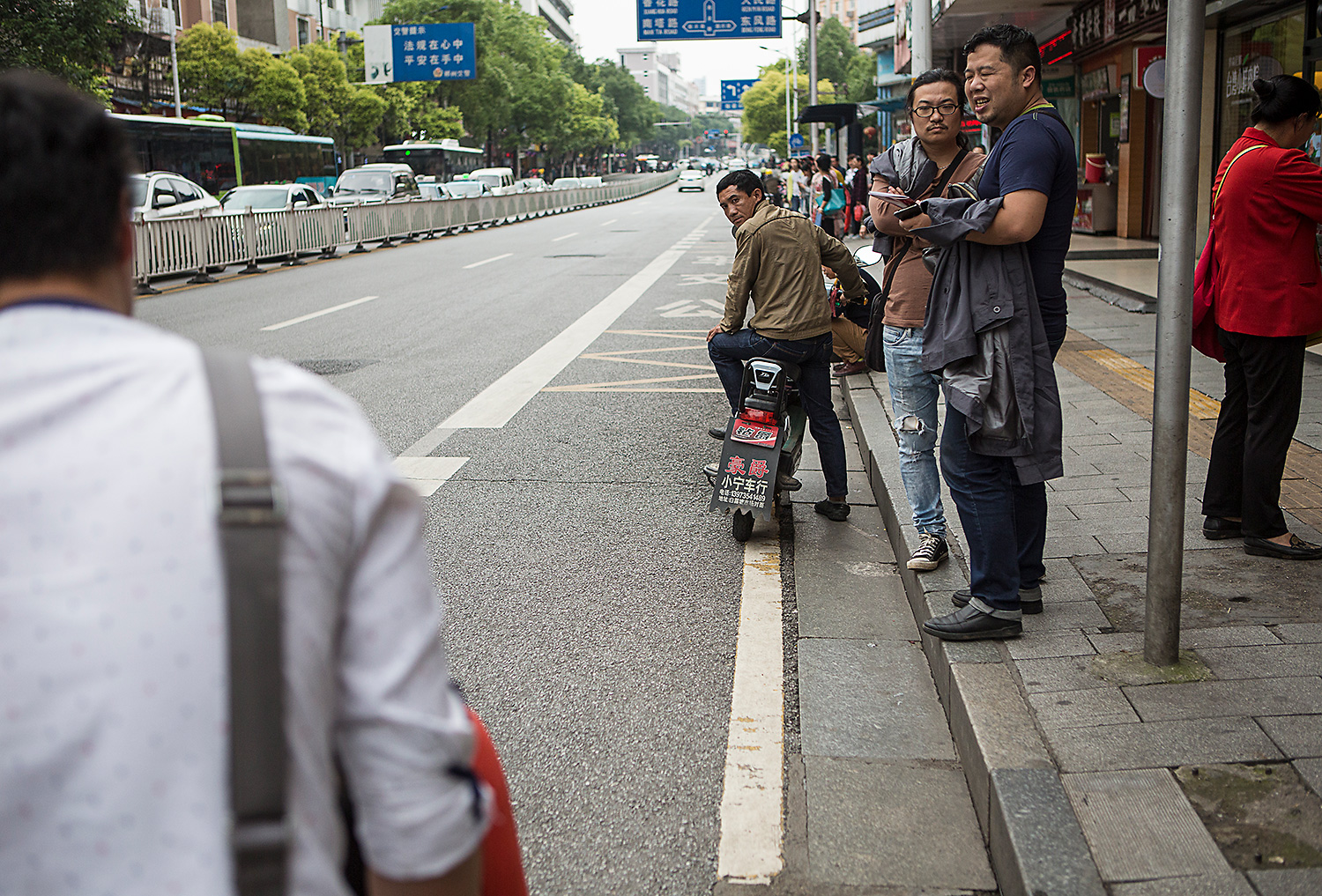 People on the street stop to stare as Chunchun and Lei Yu walk with Lei Yu’s children in Chenzhou.
