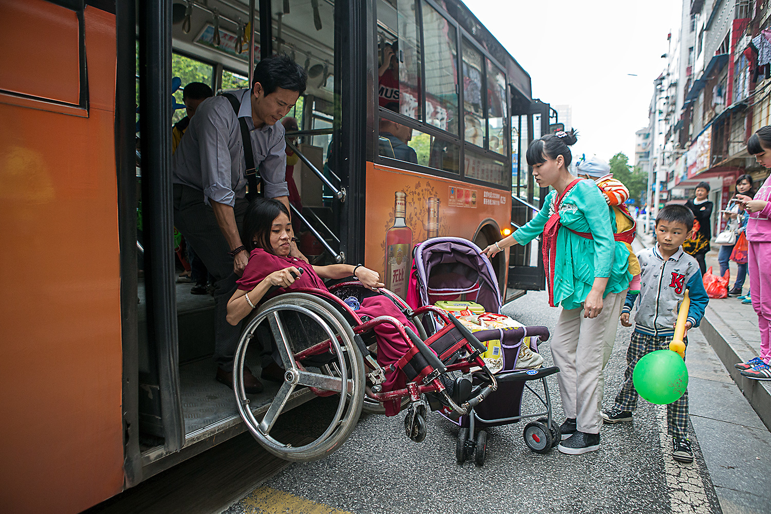 Chen Chunchun’s boyfriend, Lei Yu, who is blind, helps her down a cement ramp in Chenzhou, Hunan province. For the most part, public spaces in China are not wheelchair accessible; this is especially true in smaller cities and towns.