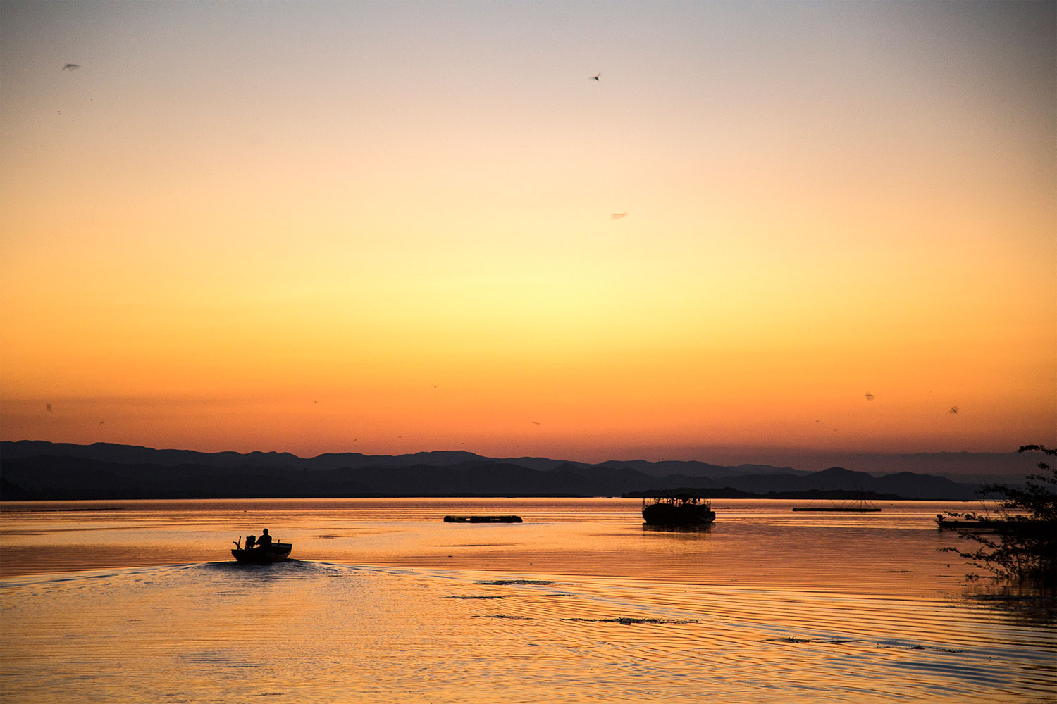 On a rainy evening in September, the fisherman Cao Suizhou, his hand on the diesel engine, steers his small motorboat by sightline of the shore. There are no stars visible above, nor lights from homes along the boundary of the water.