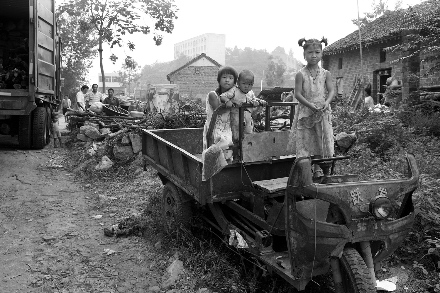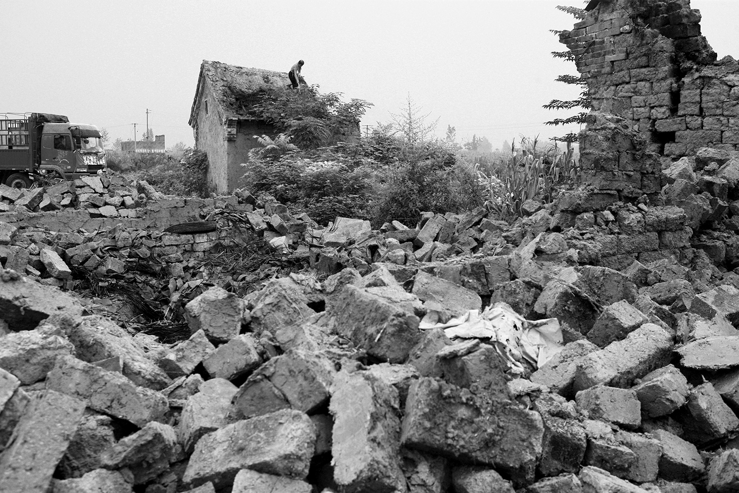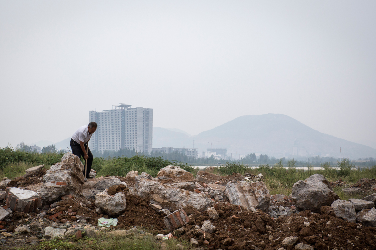 For most of his life, Cao, now in his mid-50s, lived in a small village near the shoreline. Before the water level surged, most of his neighbors boarded chartered buses bound for Xin Caowan (or New Caowan), a “relocation village” of government-built housing a hundred miles away; now all that remains of their former home is a crumbling stone water tower and a nearby field of unmarked graves. Cao’s wife, Jia Gailan, moved to New Caowan in 2009 and now looks after their two young granddaughters there, but she says that most migrants have struggled to find new work and many complain of poor quality soil and land. “The young people still leave their homes to find work in factories. But for the older people, their past work and income has disappeared.”