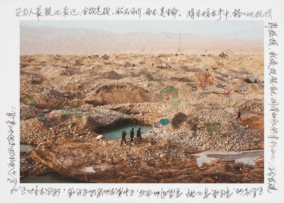 Then comes the most courageous part of the book, printed on full-sized paper. Drake writes in an afterword that the political climate had placed a barrier between her and her subjects. “I decided to stop taking so many pictures…and find ways to bring the people I was meeting into the creative process.” She did so by returning to Xinjiang with prints, and a box of scissors, pencils, paints, and glue. Meeting, as she writes, in “restaurants, art studios, shoe shops, walnut orchards, public parks, courtyards, hotel rooms, slaughterhouses, and jade bazaars,” she gave up control over her creations and encouraged her subjects to cut, color, and reassemble the photos, making new works of art.