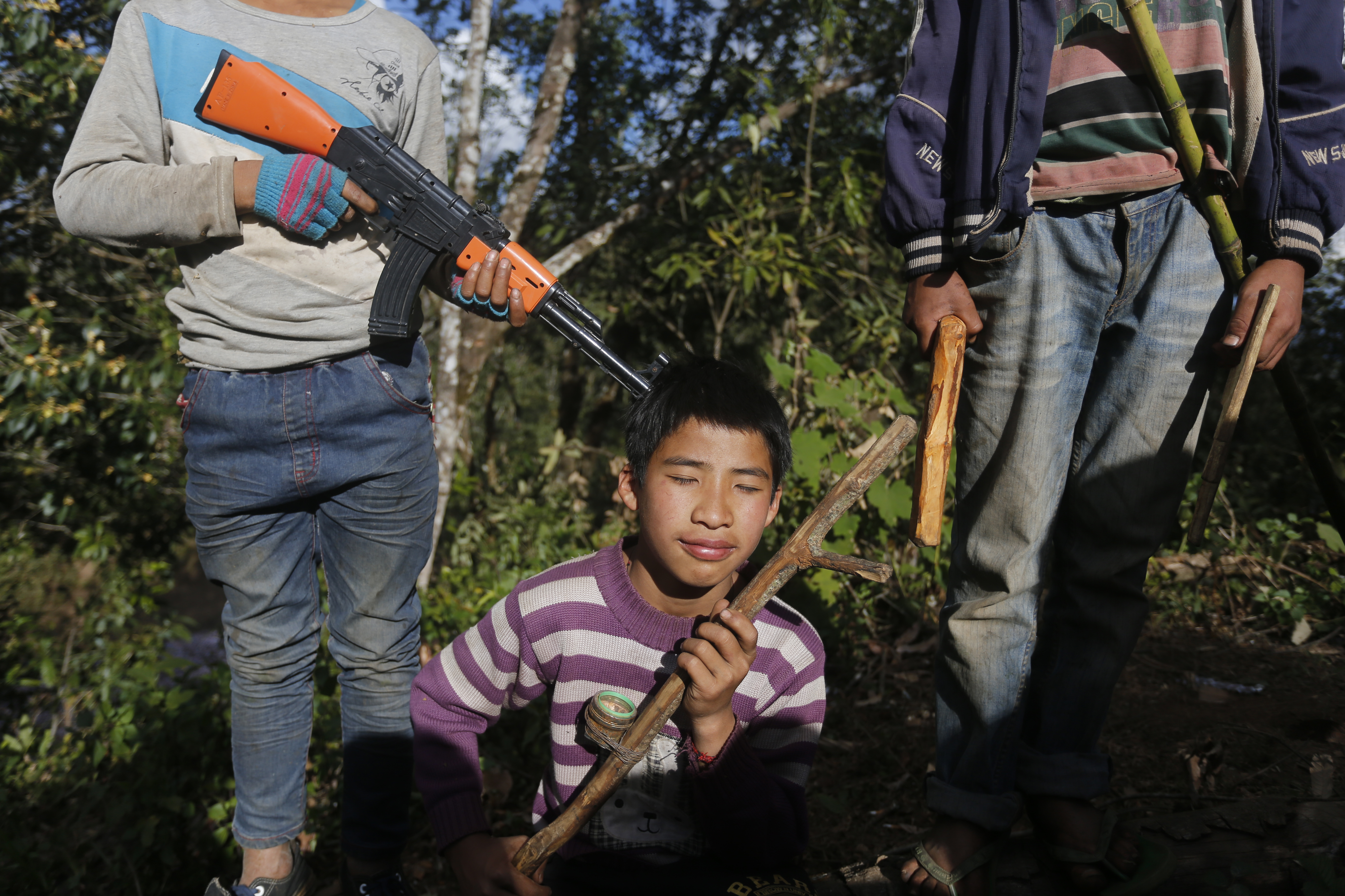 On China’s southern border, in Yunnan province, there is a school for refugees from Myanmar (also known as Burma). After a 17-year ceasefire in the internal fighting that has gone on since Myanmar’s independence from Britain in 1948, fighting erupted again in 2011 and has raged off and on ever since. Children swept up in the conflict sometimes spill over the border into China, where photographer Zhao Ming documented the refugee kids’ life at school and at play, which at times mimics all too closely the conflicts that surround them.