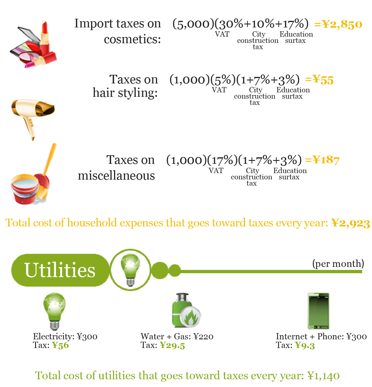 Note: For the purpose of these calculations we use 17% for value-added tax (VAT), 5% for consumption tax, and 5% for business tax; actual percentages vary depending on place and circumstance. On top of each of these taxes, the consumer pays a city construction tax and an education surtax equal to 7% and 3% of the tax, respectively.
