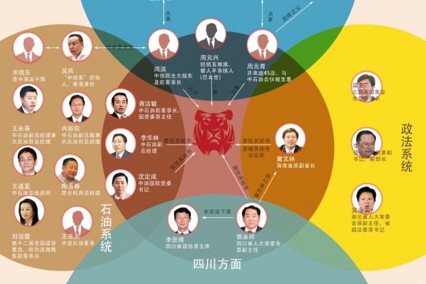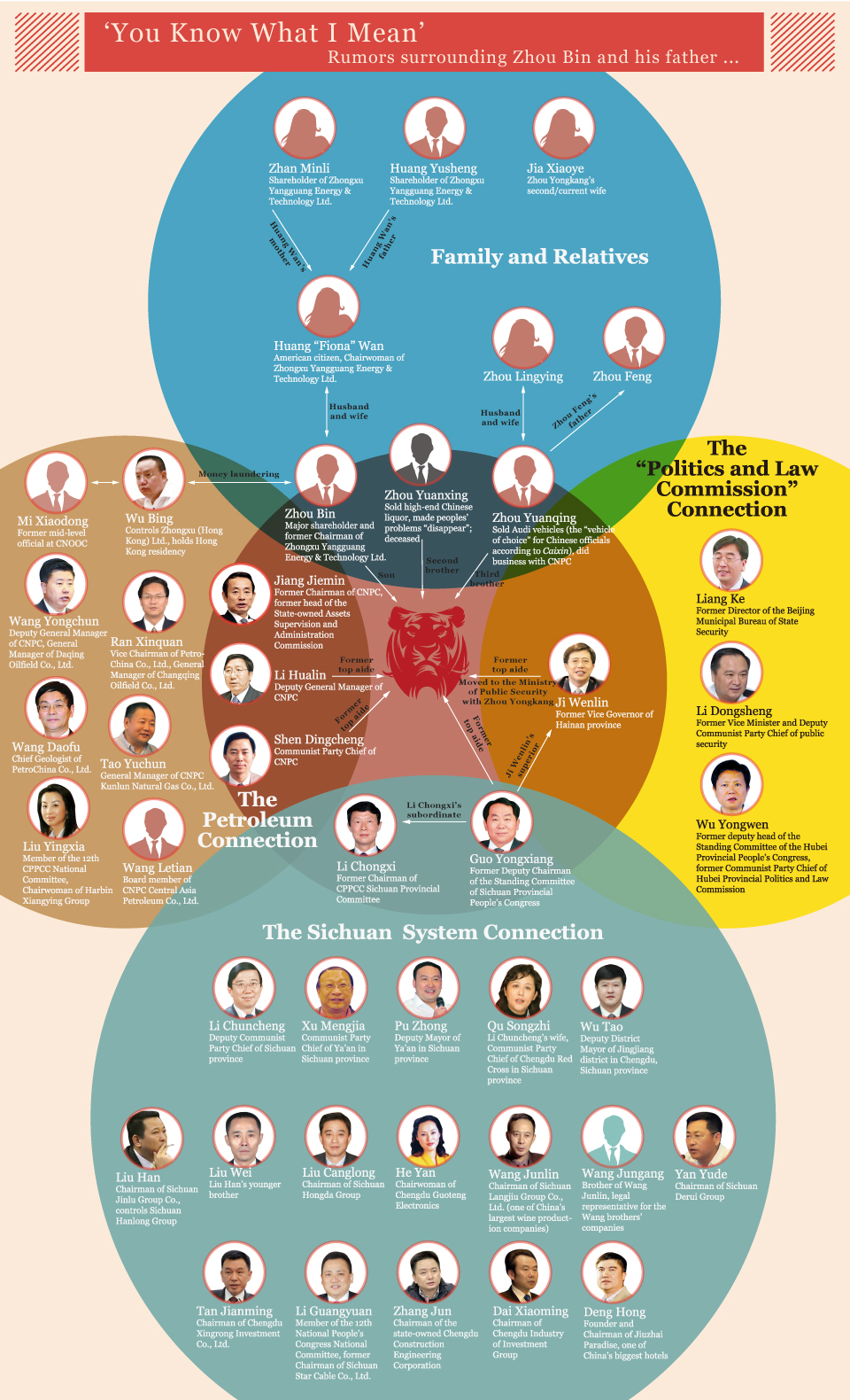 Some have published graphic representations of the web that Zhou allegedly wove. The chart below was first published in China by the popular Chinese web portal Netease on March 5, and has been adapted and translated by ChinaFile and Foreign Policy.