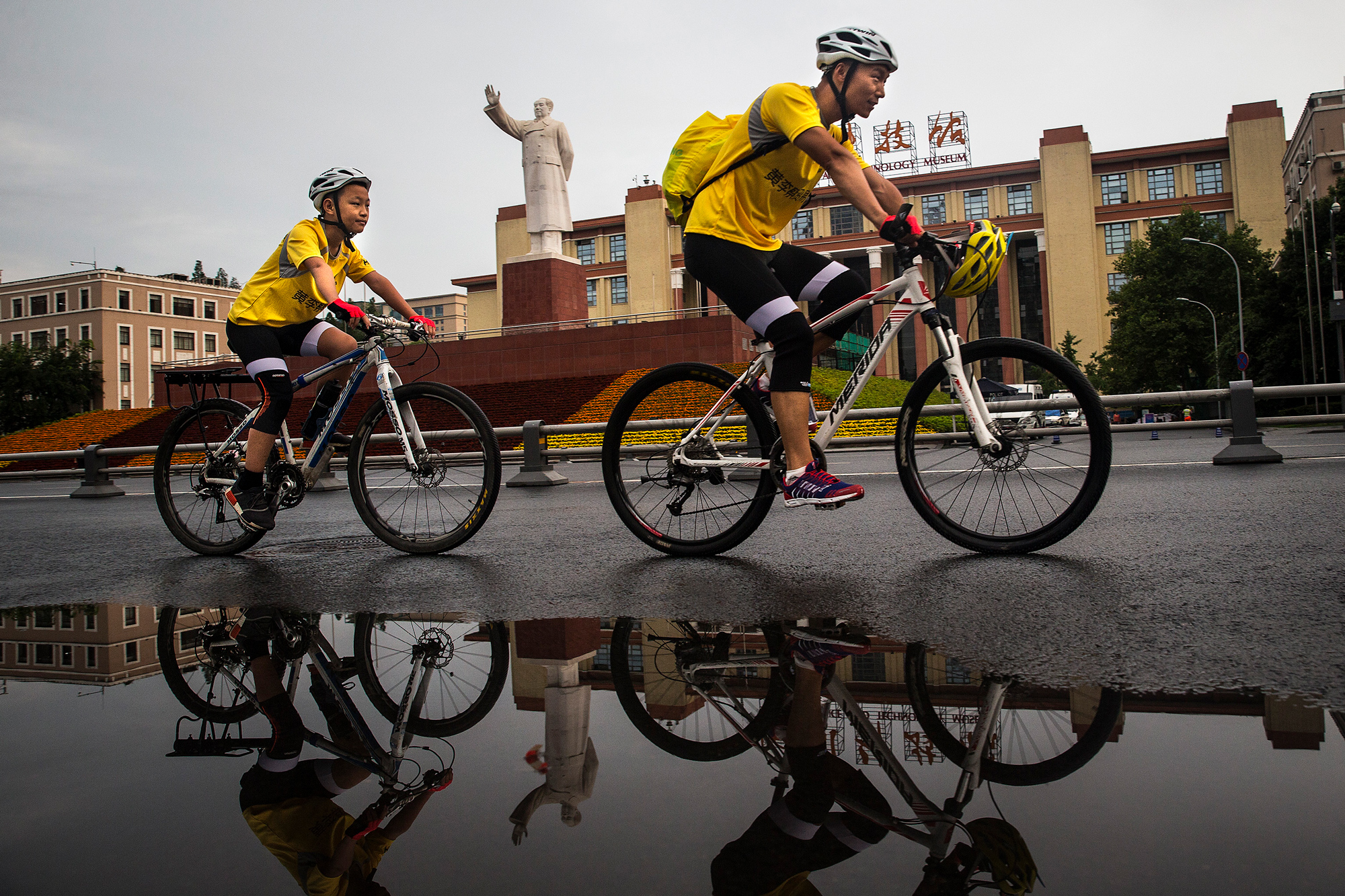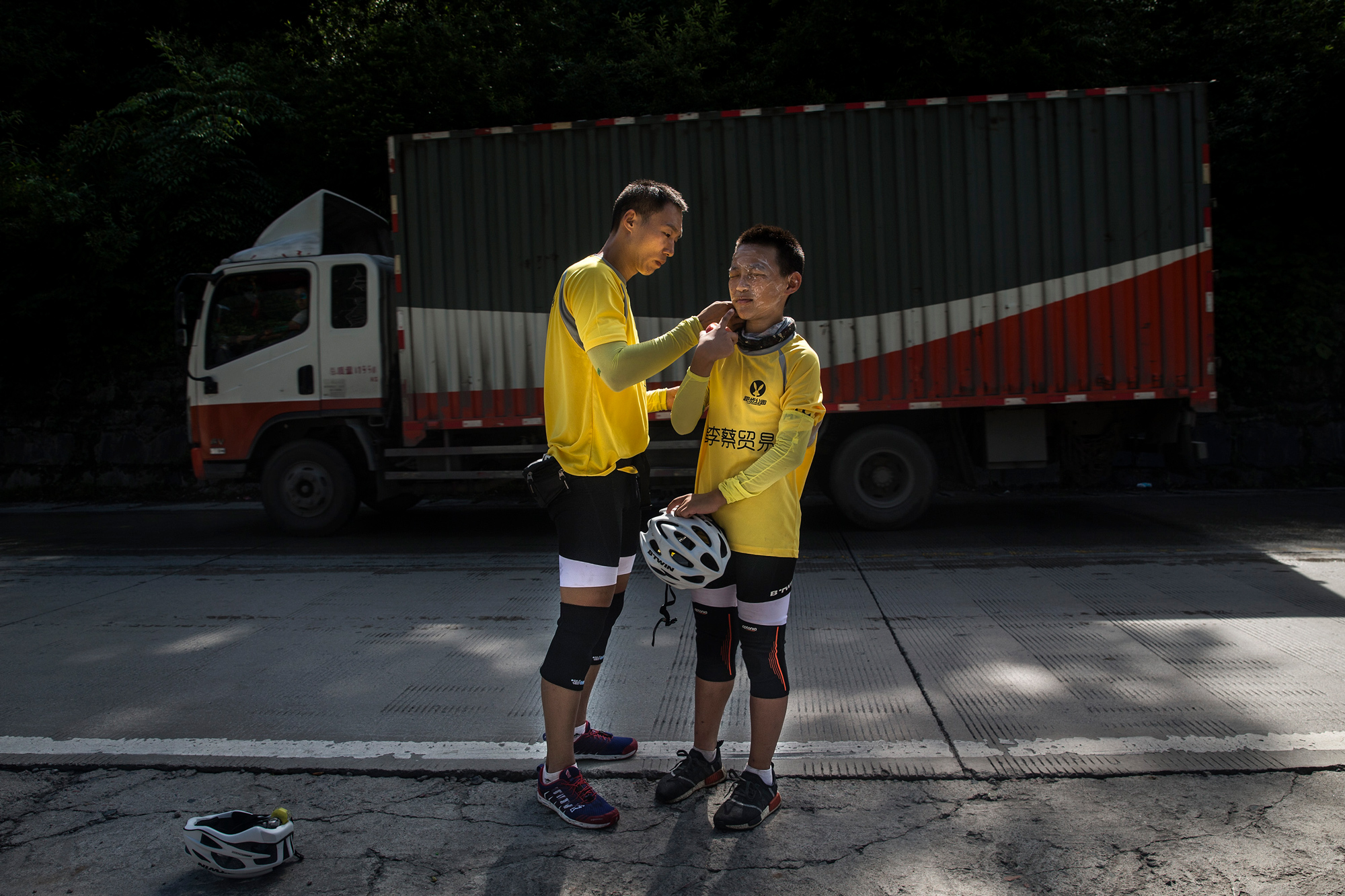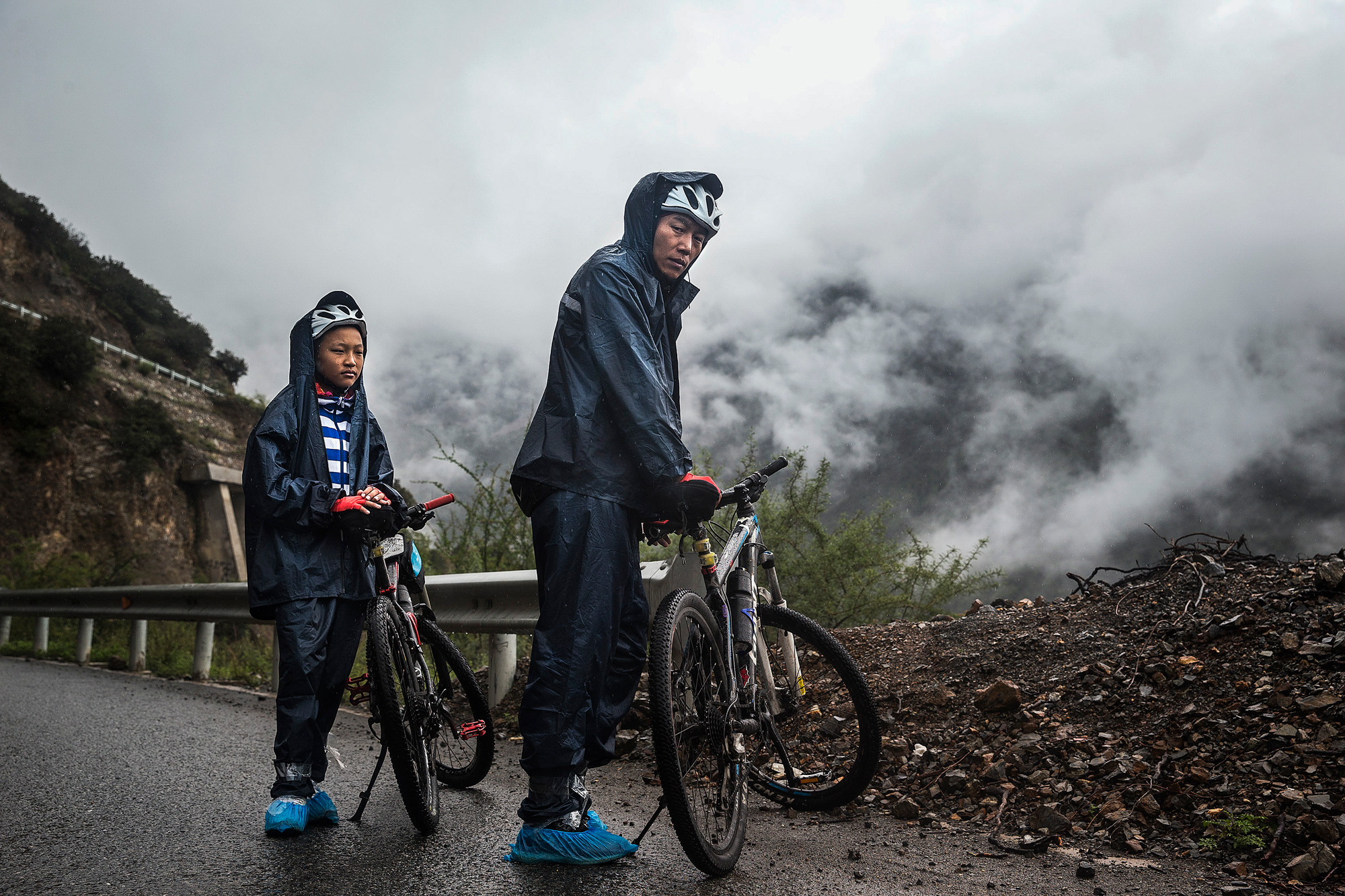 It was photographer Wang He’s second time on the Tibetan Plateau. The first hadn’t gone so well—Wang had ended up in a hospital for altitude sickness. But if he worried about whether he’d make it through his 23-day shoot along one of the world’s most treacherous roads, he had a harder time imagining how his subjects, 42-year-old Wang Chao and his 12-year-old son Runxi (who had never been at this high an altitude before), would complete the 1,300-mile trip entirely on their bicyles, as they had planned.