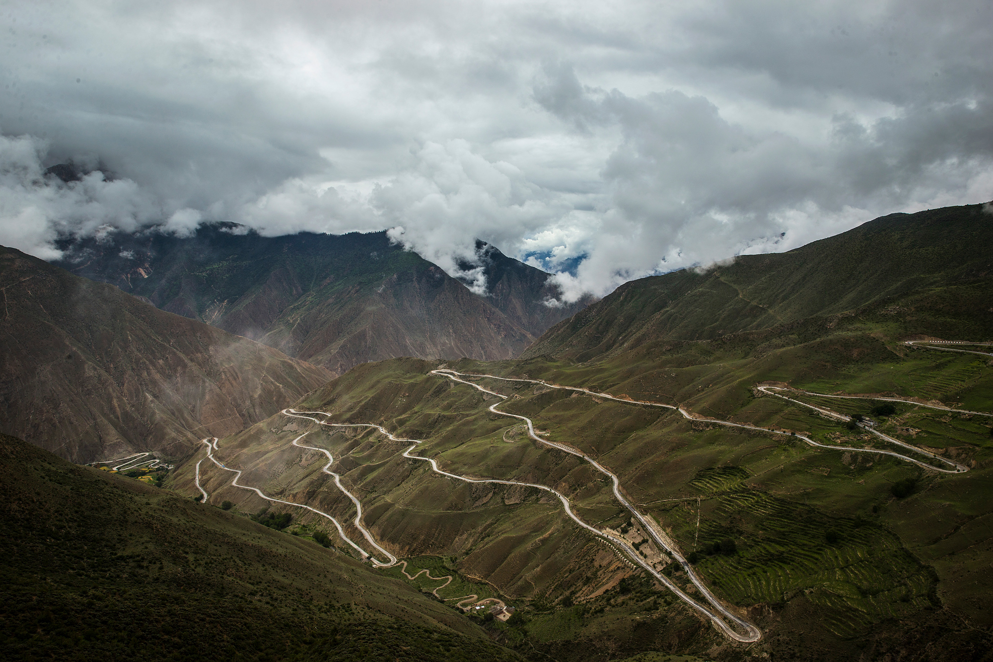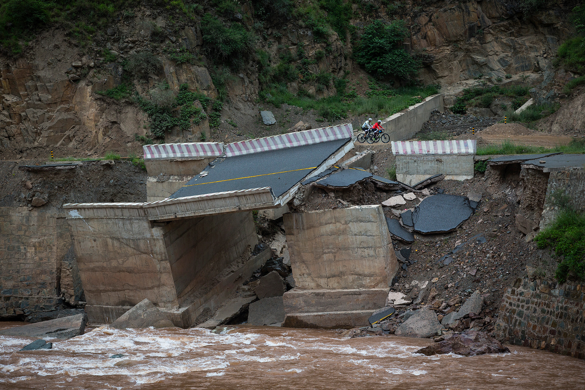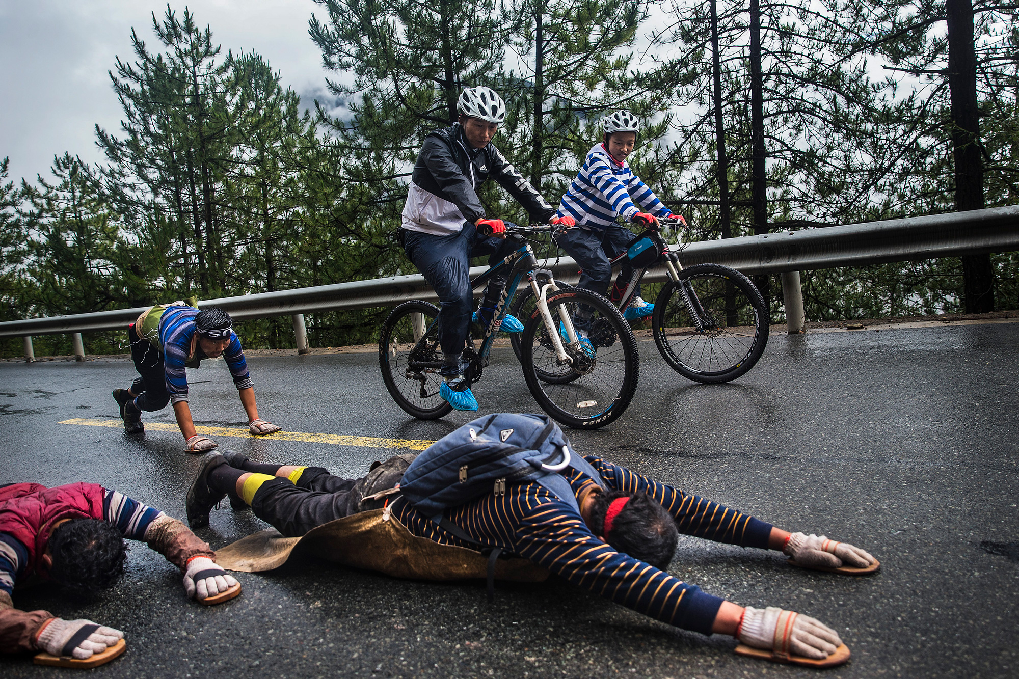 It was photographer Wang He’s second time on the Tibetan Plateau. The first hadn’t gone so well—Wang had ended up in a hospital for altitude sickness. But if he worried about whether he’d make it through his 23-day shoot along one of the world’s most treacherous roads, he had a harder time imagining how his subjects, 42-year-old Wang Chao and his 12-year-old son Runxi (who had never been at this high an altitude before), would complete the 1,300-mile trip entirely on their bicyles, as they had planned.