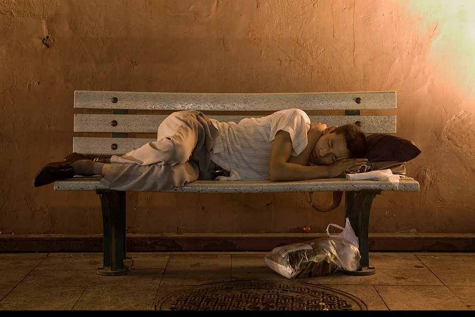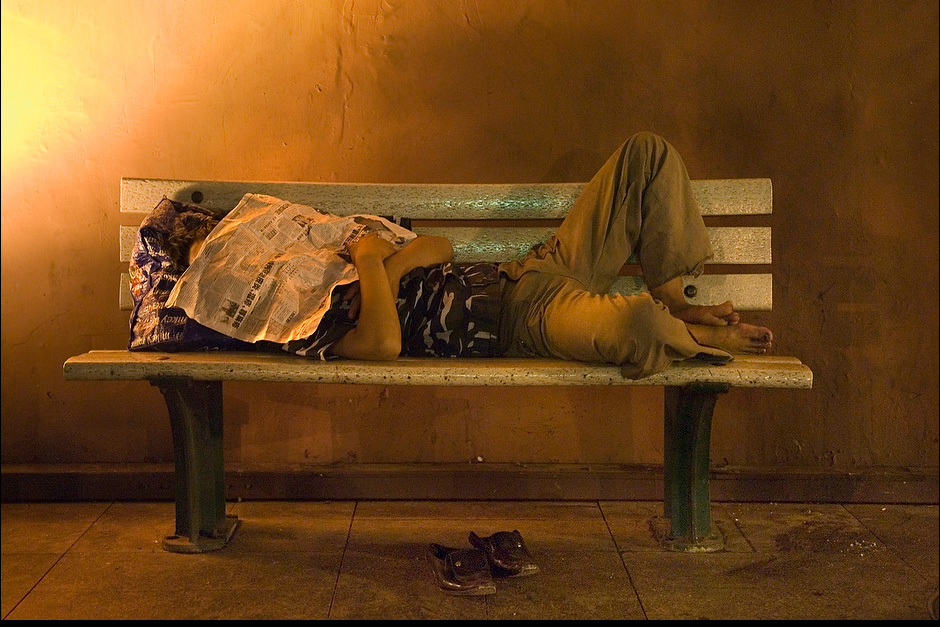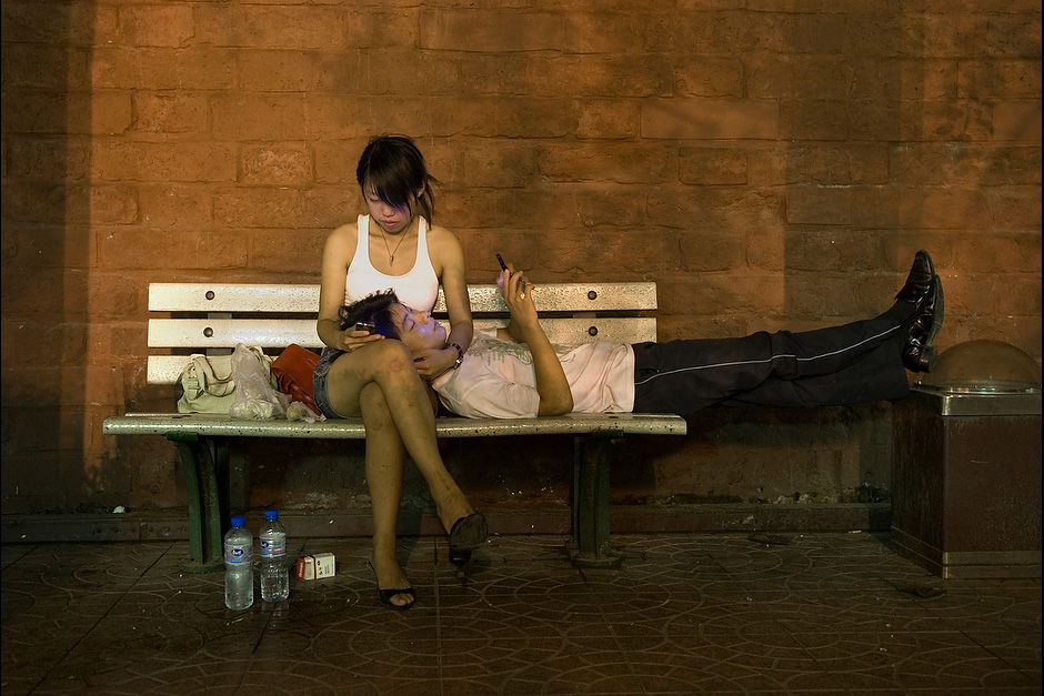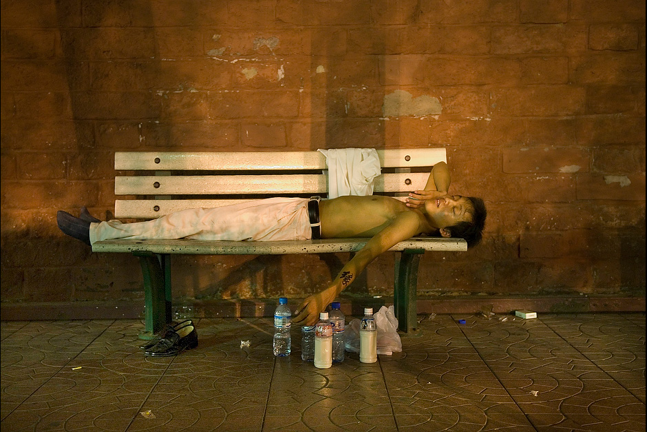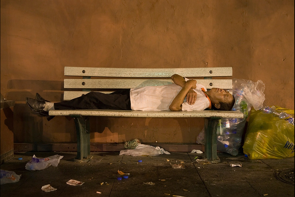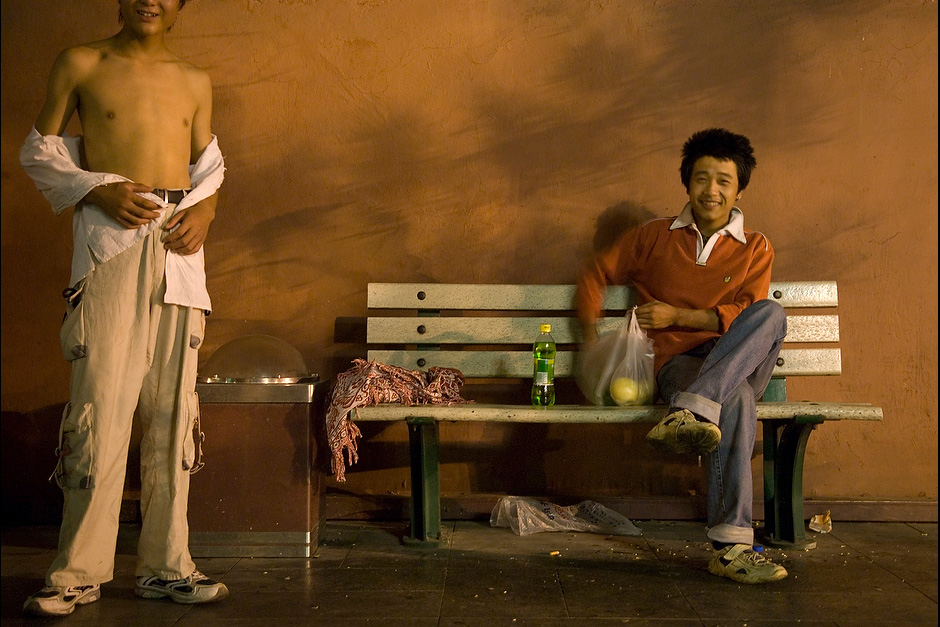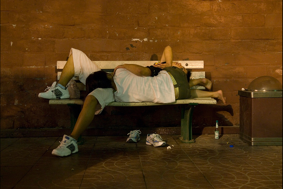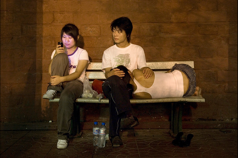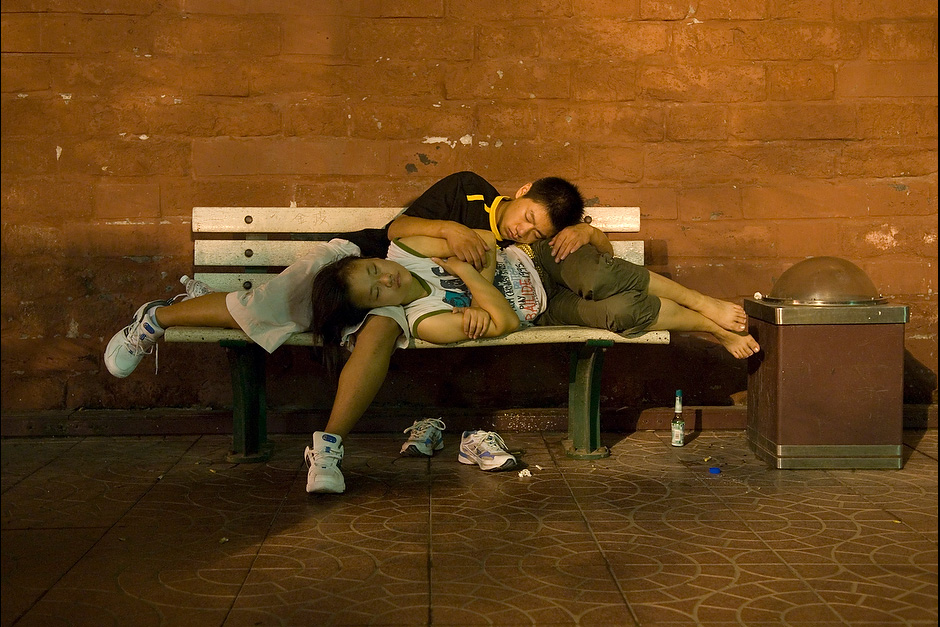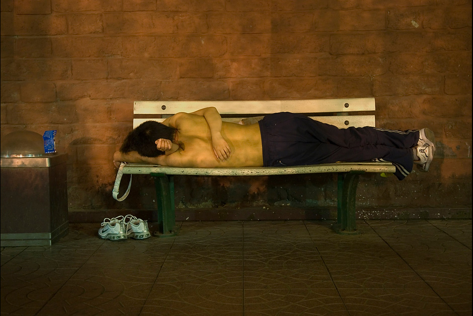 Tiananmen Square. Center of China, theater set of the Chinese Communist Party’s biggest political shows, Mecca of millions and yet a void in the city. No Beijinger in his right mind would ever suggest “meet me at the Square.” Tourists find no place to sit; they can only walk through the Square, conscious of the watchful gaze of security officers—both in uniform and out—who monitor the space for signs of protest. No Agora, Tiananmen Square is a black hole that sucks life and only allows the transient. Yet during summer nights, at its outer fringes, it becomes the People’s Square again. Tourists, lovers, homeless, peddlers, and migrants all come and stay. They carefully take off their shoes and claim ownership of the benches that line the walls of the Forbidden City. The benches become their home for a night or a few hours. They relax, if only briefly, and drift into a vulnerable sleep. The Square is theirs, until the flag rises again. —Gilles Sabrié