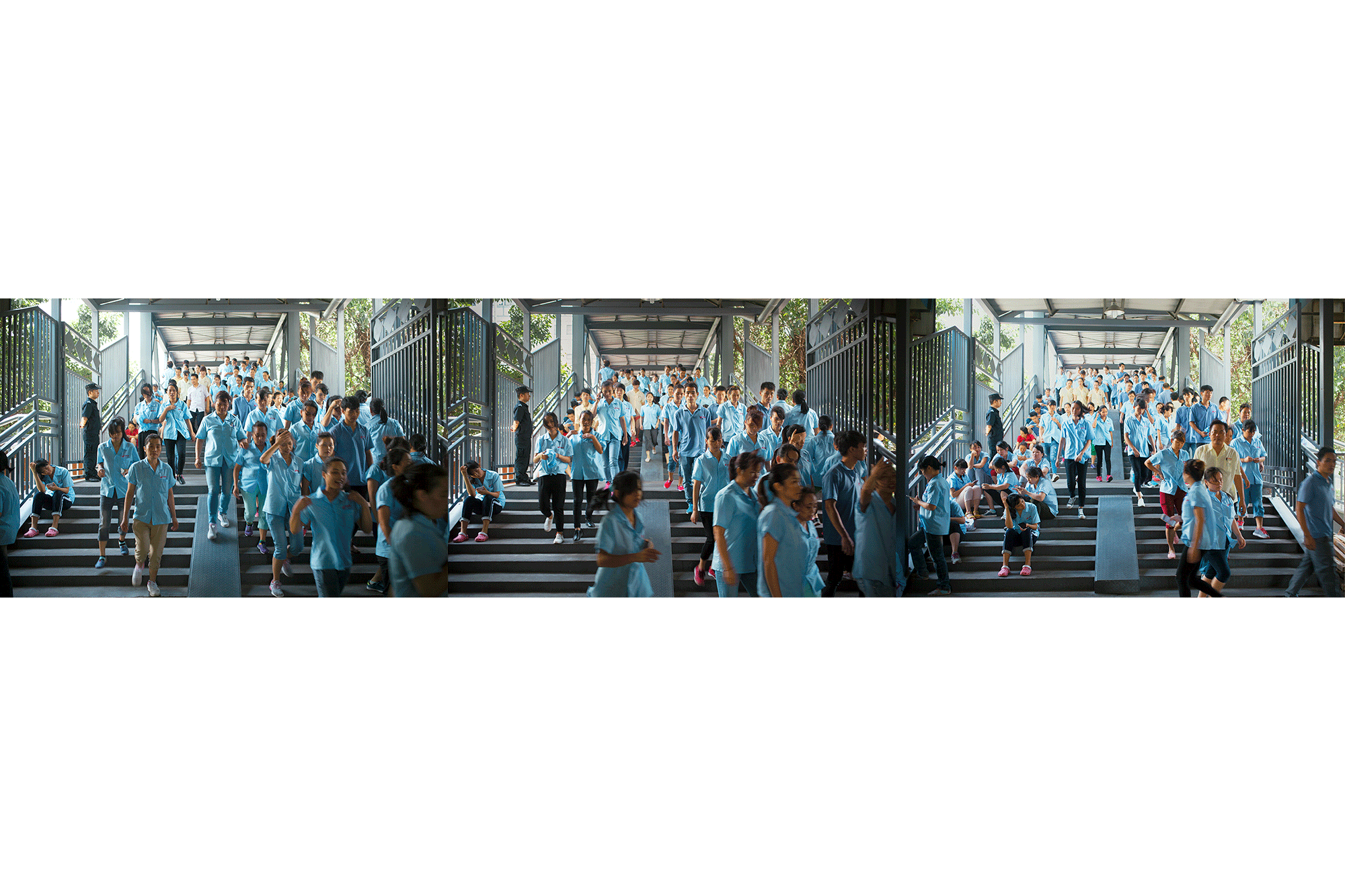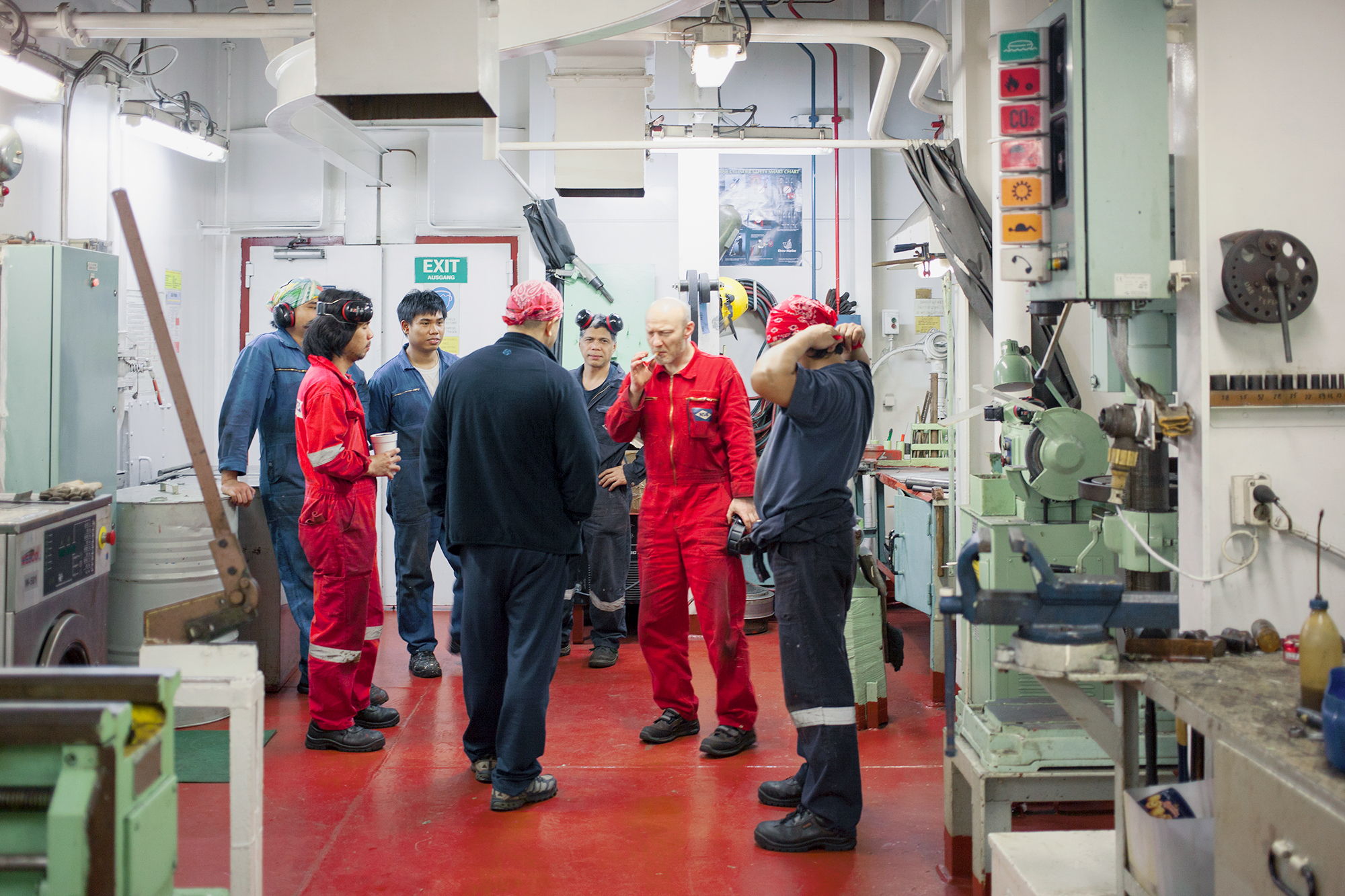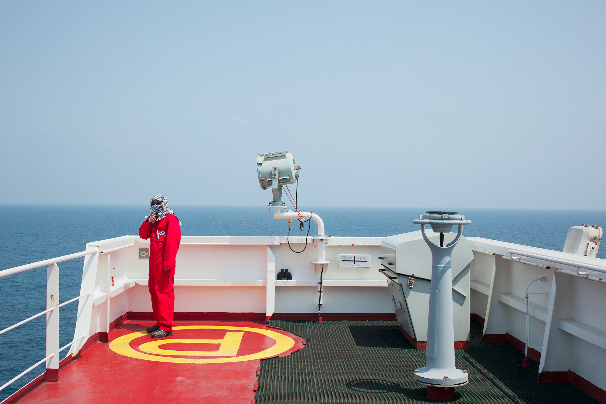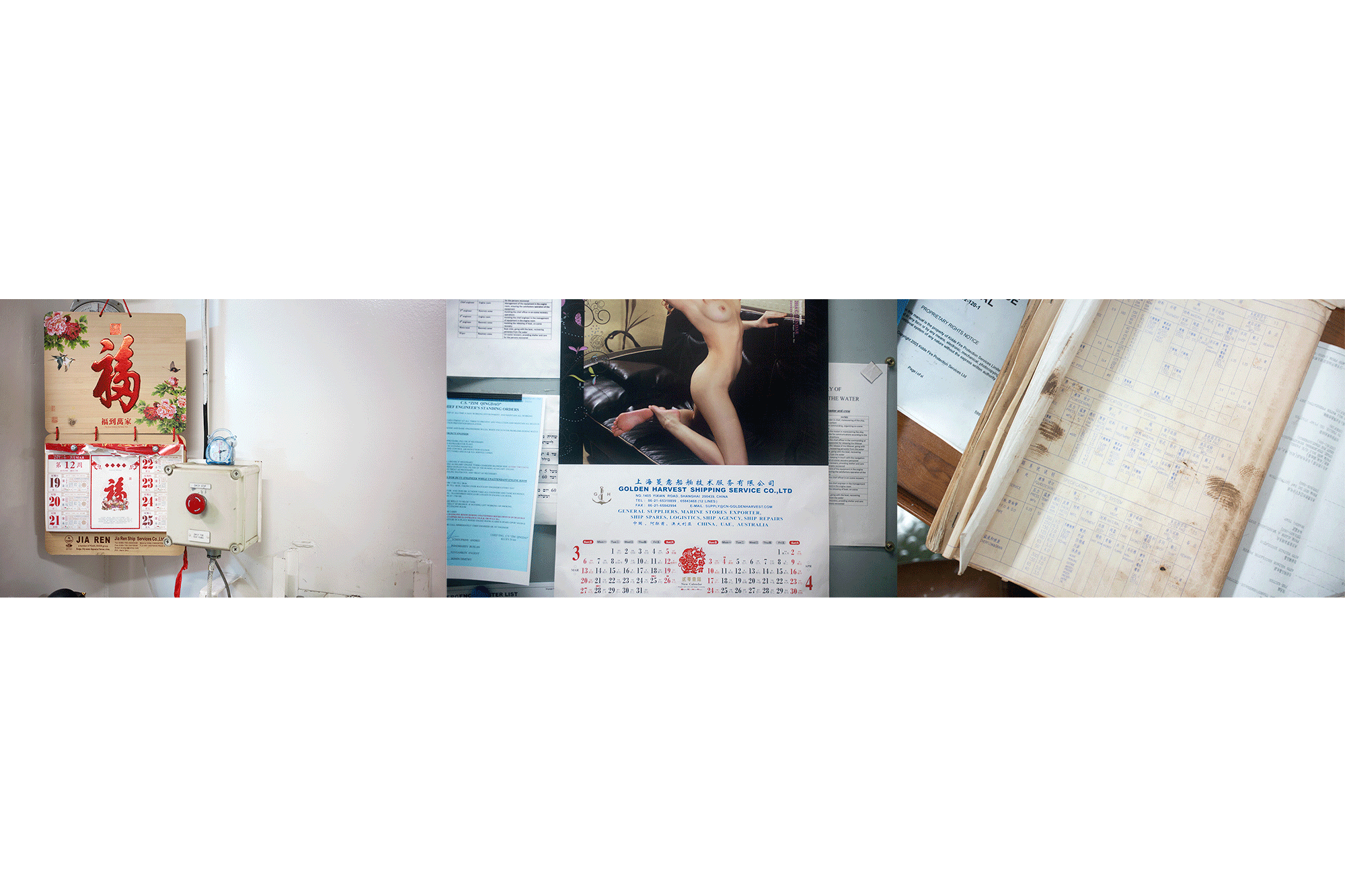 Russian-Danish photographer Mari Bastashevski set out to capture this system over a two-year journey that took her to the Port of Colombo in Sri Lanka, a Chinese-made container ship crossing the Pacific Ocean, a bottling plant in Hong Kong, a customs house in Piraeus, Greece, and elsewhere. Bastashevski’s project, she writes, “navigates through the complex, politically ambiguous, and often violent culture of logistics by which our common household products reach us.” And yet, her austere, frequently alienating images contain small moments of surprising humanity, even serenity. A Russian joins Filipino mechanics for a smoke; printing-house workers in Shenzhen beam during a break from their toil; Chinese and California state officials join together to gaze from the prow of a boat in San Pedro. Both beautiful and foreboding, Bastashevski’s work unmasks a world that each of us—perhaps without thinking or knowing—have already built together.